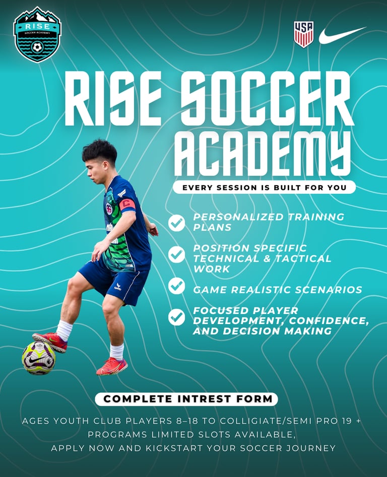 Rise Soccer Academy delivers elite youth soccer training built around personalized training plans for every player. Our sessions emphasize position-specific technical and tactical development, game-realistic scenarios, and focused player growth. We prioritize confidence and decision-making in every environment, ensuring players are prepared to perform when it matters most. Every session is built for you.